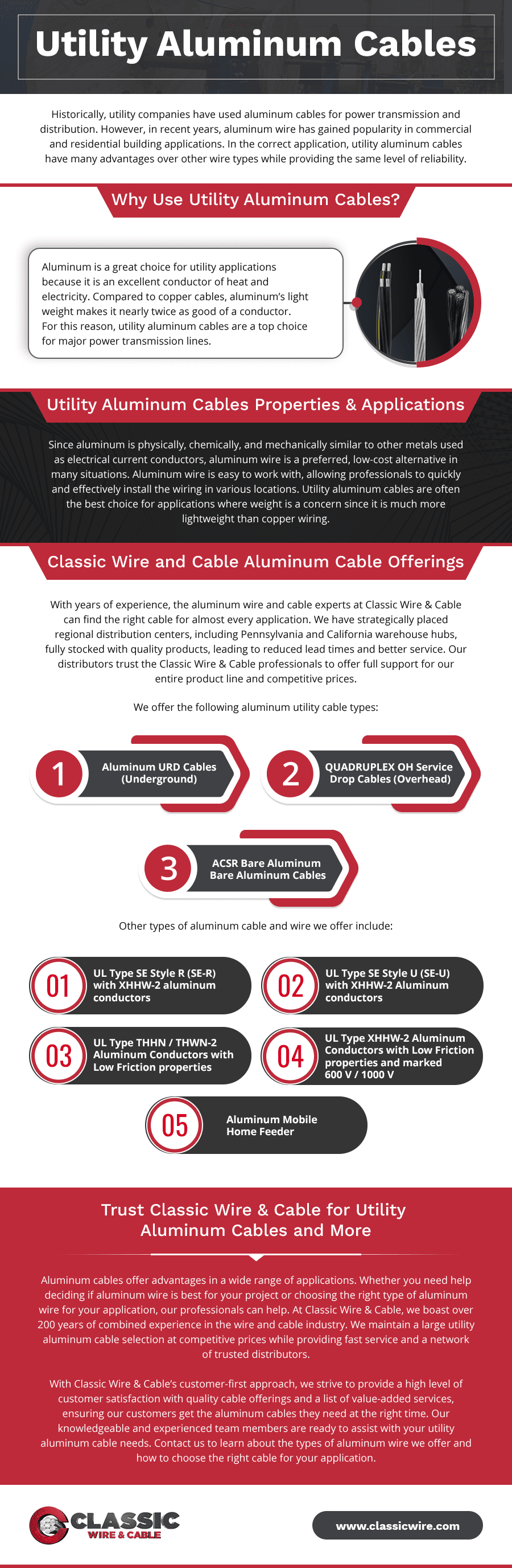 Classic Wire & Cable has the expertise you need. With over 200 years of combined experience in the wire and cable industry, our team knows what it takes to deliver high-quality products. Moreover, our strategically placed regional distribution centers across the country to ensure fast delivery and competitive pricing on a wide range of utility aluminum cables.
